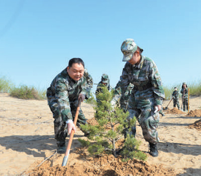 行进10分钟,终于到达了植树点。女民兵们有序分工,挖土、扶苗、填土、浇水……每道工序做得一丝不苟。现场负责指挥的郑宏利是治沙连副政治指导员,今年31岁,已经在连队工作了8年。她经验丰富,一边指挥,一边向大家讲解植树技巧,“挖坑要根据树苗土球的大小来挖,种的时候要把土球外的塑料包装给去掉,确保种一棵活一棵。”