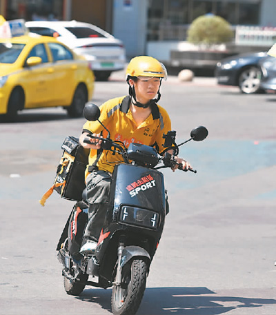 6月27日,重庆市气象台发布今年首个高温橙色预警信号。图为在重庆市沙坪坝区三峡广场,外卖配送员在高温下辛勤工作。 |