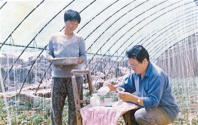 1996年,关慧明(右)在乌兰察布市集宁区罗家村的大棚内进行施肥试验。 |