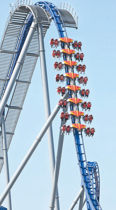 湖北襄阳深化服务理念,提供安全保障措施,营造安全放心的消费环境。图为游客在襄阳华侨城奇幻度假区体验过山车。 |