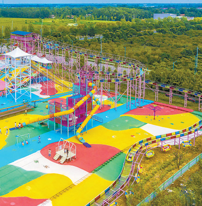 江苏省宿迁市宿豫区坚持“农旅结合、以旅强农”,充分利用生态资源优势,积极推进现代休闲观光农业和乡村旅游融合发展。图为近日,游客在新庄镇杉荷园社区森林王国游乐园游玩。 |