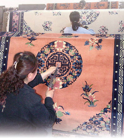 盐池县一家地毯生产企业的工人在制作羊毛地毯。 |