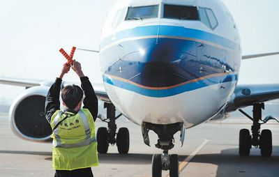 飞机要降落了,魏文楷和同事提前15分钟来到停机坪,先检查、清理地面杂物,再引导飞机就位。