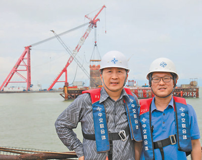 孟凡超(左)与港珠澳大桥管理局工程师在人工岛施工现场。 |