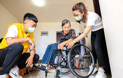 6月25日,工作人员在内蒙古自治区呼和浩特市玉泉区康居家园小区为老人演示轮椅的使用方法。 |
