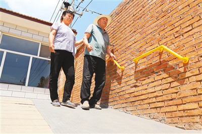 6月16日,河北省张家口市桥东区两位老人在装有扶手、防滑地胶的院内行走。 |
