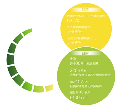 看现代农业经营体系,集约化、专业化、组织化、社会化程度不断提高。专业合作社、家庭农场等新型农业经营主体发展壮大,在良种繁育推广、绿色统防统治、标准化生产等领域积极探索,带动农民、连接市场、引领发展。目前,全国近400万个家庭农场、220多万家农民合作社提高农业组织化程度。超过107万个各类农业社会化服务组织成为贴心“田保姆”,服务带动小农户9100多万户。