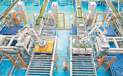 新疆天山面粉小麦食品加工产业园区,智能机器人对成品面粉进行码垛。 |