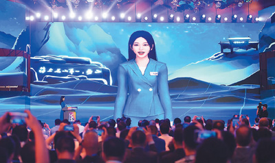 在山东省青岛市崂山区举办的2023国际虚拟现实创新大会开幕式上,现实和虚拟主持人的双向互动成为会场亮点。 |