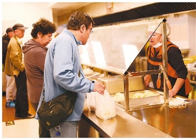 10月13日,吉林省长春市新区飞跃街道三佳社区敬老餐厅内,老年市民正在选取午餐。 |