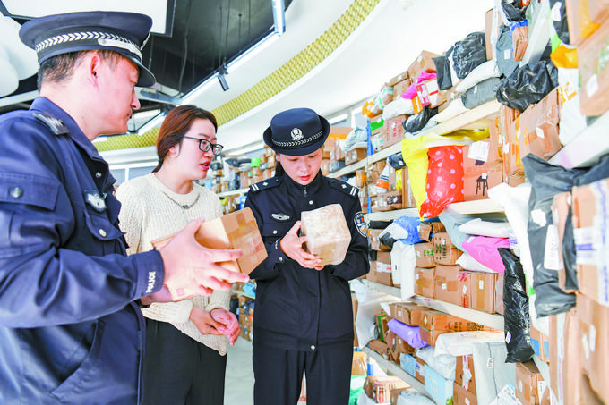 图为民警在辖区一寄递物流企业开展检查。冯善军 摄