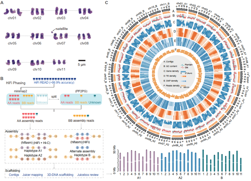 近年来,广东省农科院果树所的香蕉资源圃通过大规模引进、收集,保存有各类种质资源超过600份,是世界最大的香蕉资源圃之一。此次研究以团队新选育的“美食蕉1号”和Silk品种为对象,完成了其单倍型基因组的组装解析,并对其进行了深入分析,为阐明香蕉遗传多样性奠定了基础。团队通过分析基因组来源,首次精确阐明了Plantain和Silk的祖先贡献。