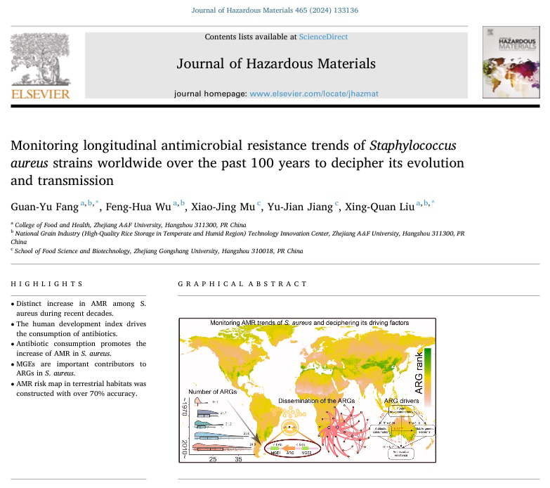 金黄色葡萄球菌是一种常见的食源性致病菌,抗生素治疗金黄色葡萄球菌感染,是常用的医疗手段。但由于抗生素广泛使用,大量致病微生物出现抗生素耐药性,这种耐药性给国际公共卫生带来了严峻挑战,也加重全球患者和卫生系统财政负担。近日,浙江农林大学食品与健康学院刘兴泉教授团队发现了金黄色葡萄球菌耐药基因的进化和传播机制,相关论文发表在国际期刊《危险材料杂志》上。