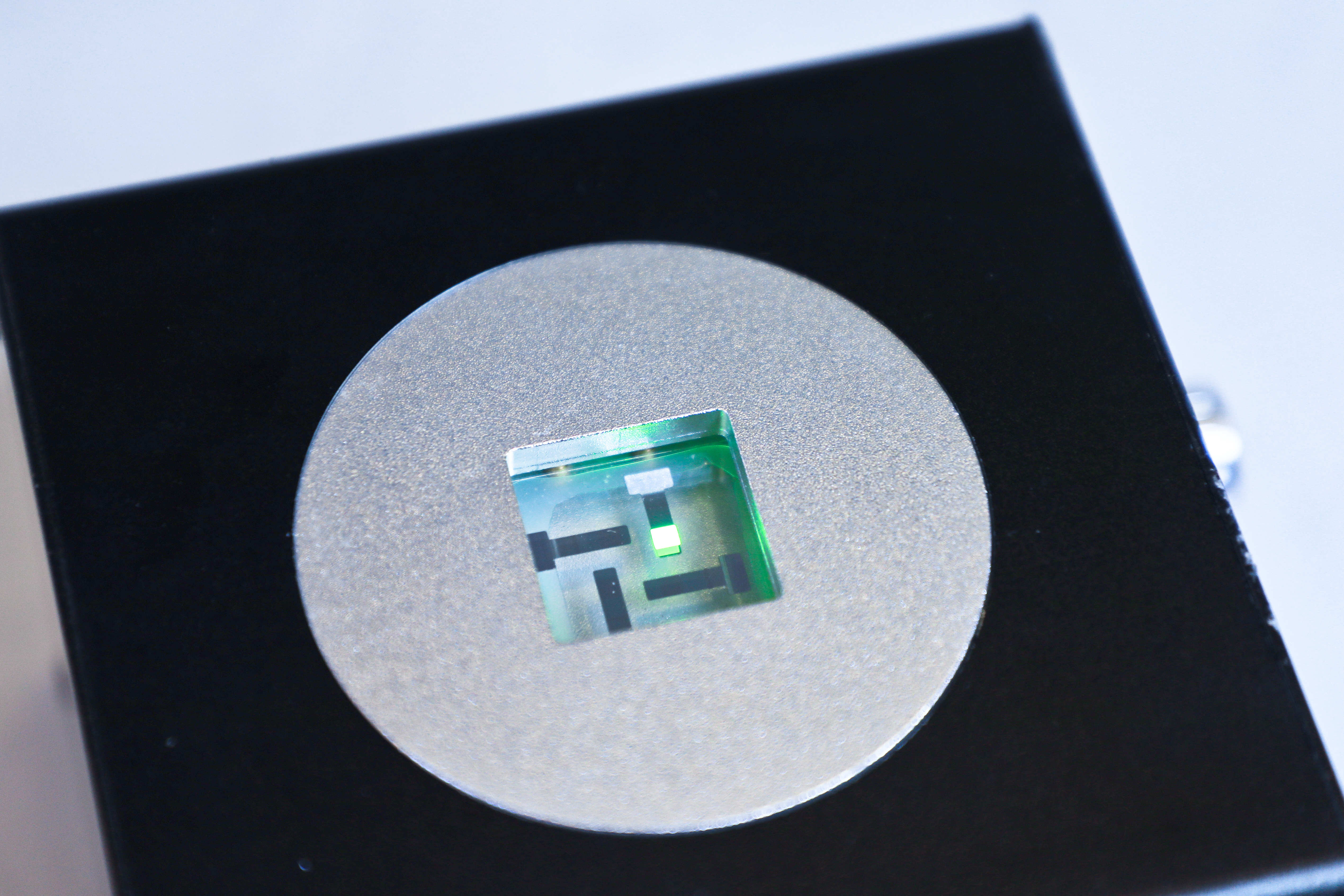 经过“溶剂筛”处理后的钙钛矿发光二极管呈现明亮的绿色电致发光效果。受访单位供图