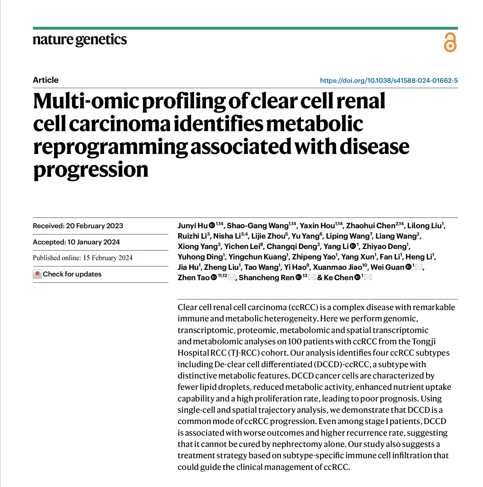 2月21日,记者从华中科技大学附属同济医院获悉,该院泌尿外科谌科教授、王少刚教授、管维教授,肿瘤科陶振教授与海军军医大学附属长征医院泌尿外科任善成教授联合揭示了肾透明细胞癌广泛进展模式。相关研究成果日前在线发表于学术期刊《自然·遗传学》。
