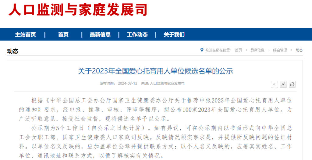 本次候选名单涉及北京市、天津市、河北省、内蒙古自治区等地的爱心托育用人单位。据介绍,目前全国提供托育服务的机构已近10万个,托育服务位数约480万个。