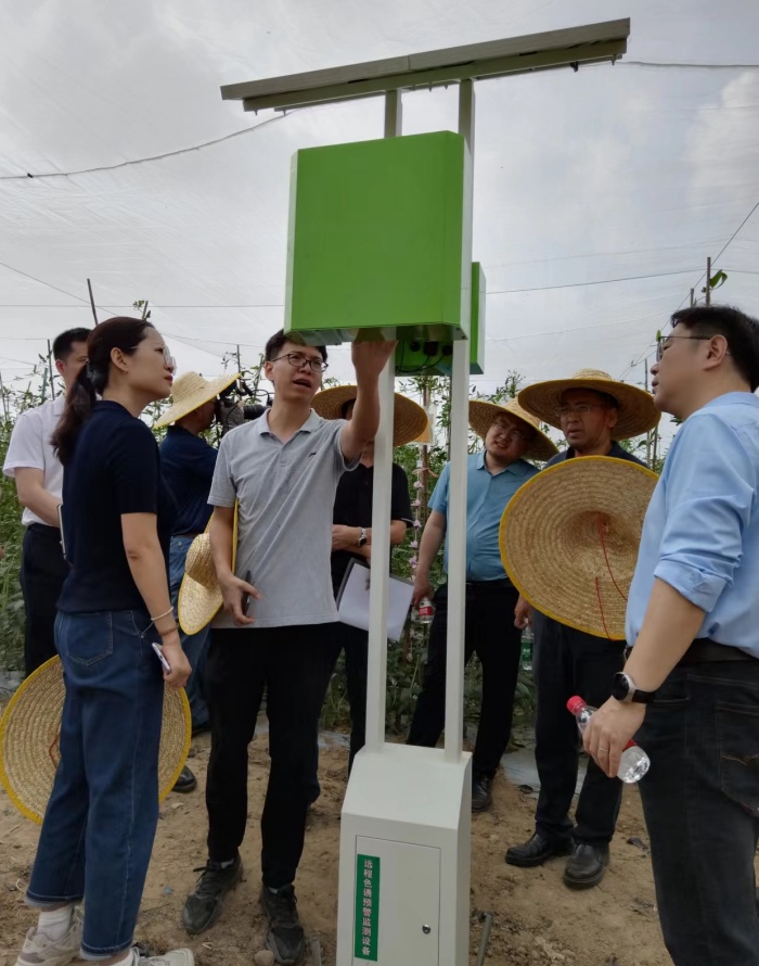 科研人员介绍豇豆病虫害远程色诱预警监测设备