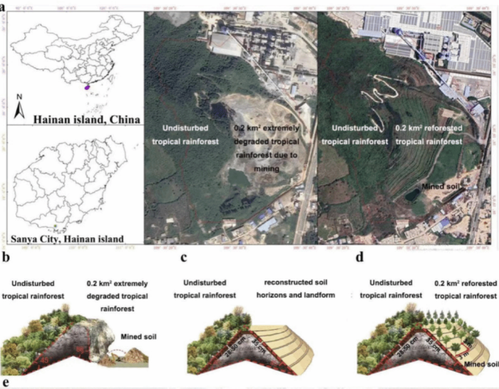 据了解,成功的矿山修复需要先恢复矿山原来的微生物多样性及受其调控的物质循环和生态系统功能。根据此思路,张辉团队以矿山开采过程中保留的热带雨林土壤为基质,参照矿山附近未破坏的热带雨林坡度、土壤深度等数据,重新构建了矿山土壤层,并种植了多种可快速生长的造林树种,来为土壤提供有机质,改善土壤pH值。实验结果表明,这种技术复垦手段只用不到5年就成功恢复了矿山原来的微生物多样性及受其调控的氮、磷物质循环过程。