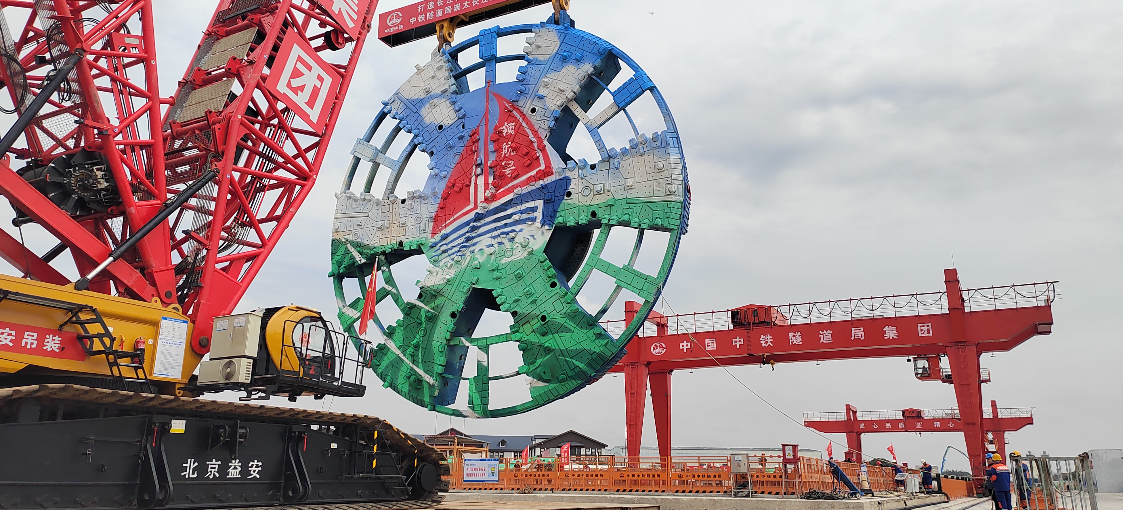 3月27日,上海崇明万安村,沪渝蓉高铁崇太长江隧道3号盾构始发井施工现场,世界最大直径国产高铁盾构机——“领航号”刀盘与主机成功合体,标志着“领航号”盾构机组装进入了最后冲刺阶段,即将始发。