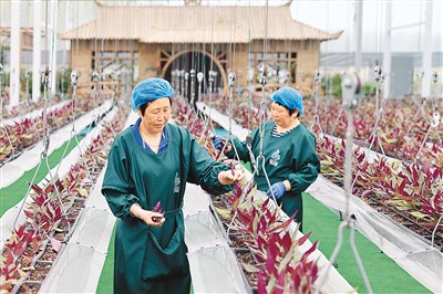 工人在江苏省泰州市姜堰区溱湖智慧农业园数字化工厂内修剪植物。 |