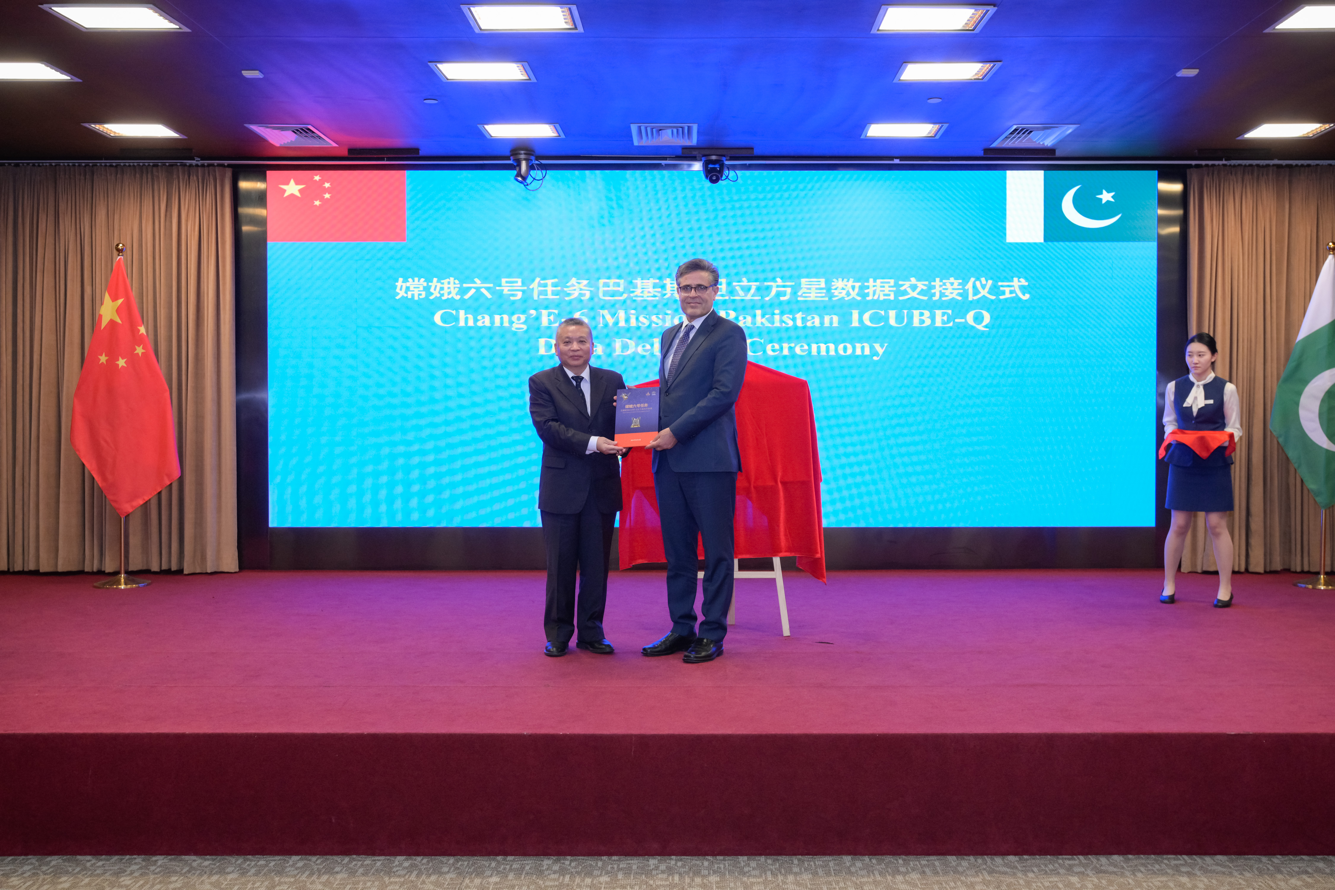 中国国家航天局局长张克俭向巴基斯坦驻华大使卡里尔·哈什米交接数据,并共同为嫦娥六号任务巴基斯坦立方星拍摄的首幅影像揭幕。