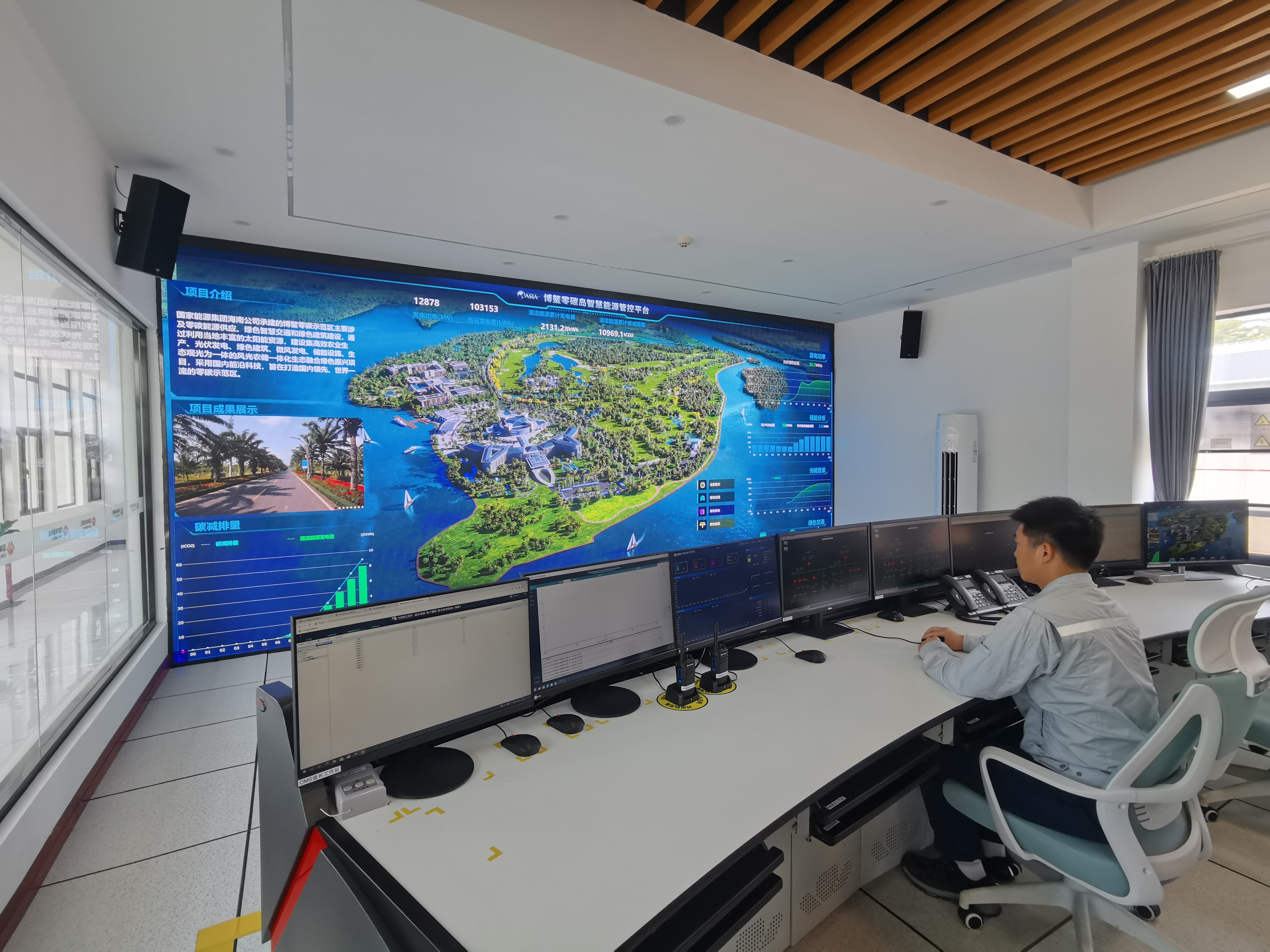 “‘近零碳运行管理中心’是示范区的‘大脑’。”闫亮说,该中心通过物联网监测设备,在虚拟端构建了数字孪生的东屿岛,可以实现对博鳌近零碳示范区可再生能源利用、交通电气化、建筑绿色化、园林景观生态化、减排等各类数据系统的实时监测、统一调度和智慧化运营管控。