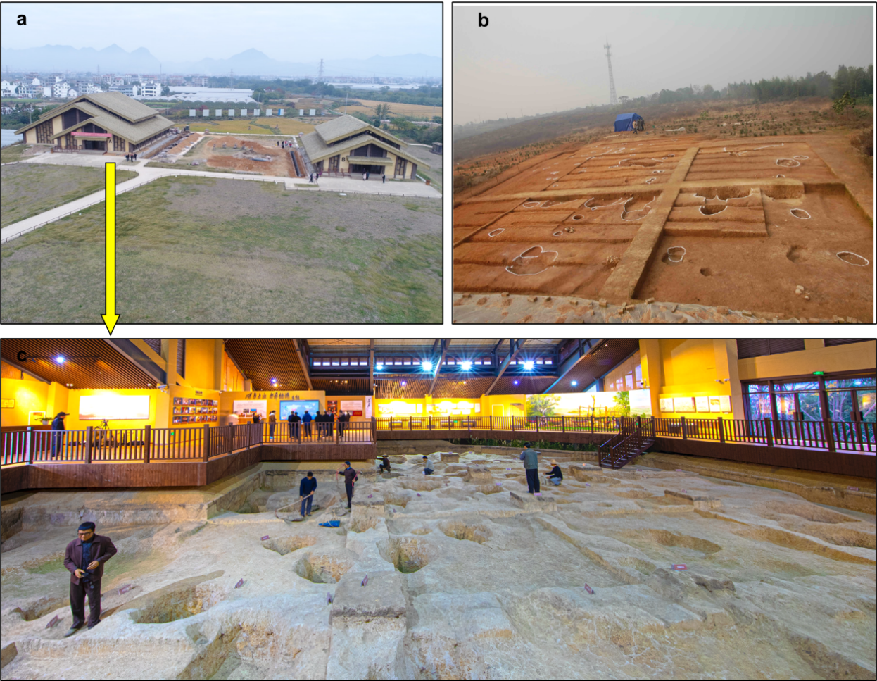 上山遗址(a和c)及荷花山遗址(b)的位置。中国科学院地质与地球物理研究所、浙江省文物考古研究所供图