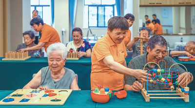 图为日前上城区小营街道中大朗颐养老服务中心内,工作人员带领老人在做益智游戏。