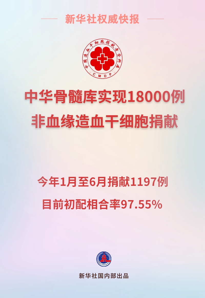 记者从中华骨髓库获悉,截至7月12日,中国红十字会中华骨髓库非血缘造血干细胞捐献量实现18000例。