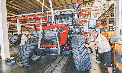 八月二十七日,山东青州经济开发区一家大马力拖拉机制造企业内,工人正在车间进行装配作业。 |