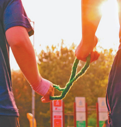 盲人与志愿者手中牵的陪跑绳。 |