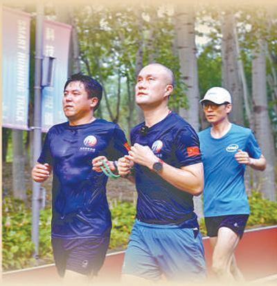 志愿者带着何亚君(中)一起跑步。 |