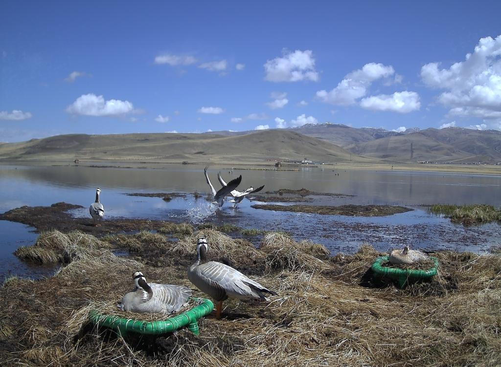 在甘肃尕海则岔国家级自然保护区,栖息的斑头雁通过人工鸟巢坐巢孵化后代(资料照片)。新华社发(甘肃尕海则岔国家级自然保护区管理局供图)